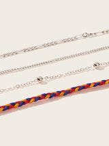 Tanab, multi layered boho anklet featuring three dainty chain anklets and one retro color rope wovenanklet.