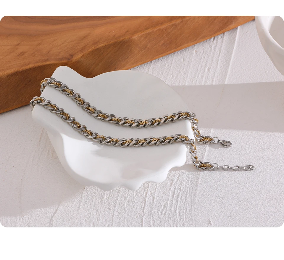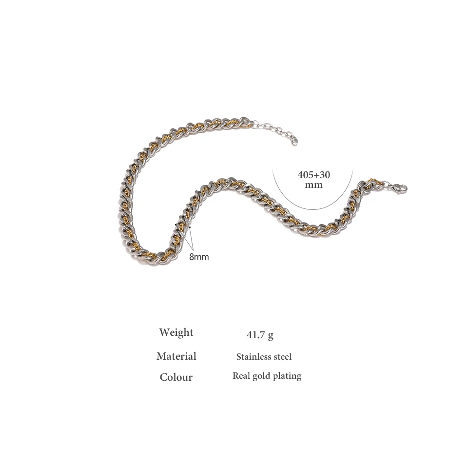 Two-Tone Rope Necklaces for Women is a versatile accessory designed to enhance any outfit with its statement metal texture and geometric pattern. Crafted from durable stainless steel, this waterproof collar necklace combines fashion and functionality, making it suitable for everyday wear or special occasions like parties. The link chain design is compatible with all styles, and the real gold plating adds a touch of luxury without the concern of harmful chemicals. Its trendy appearance ensures you stay fashionable while enjoying a piece that withstands the test of time and wear. Ideal as a gift, this necklace blends modern style with lasting quality.